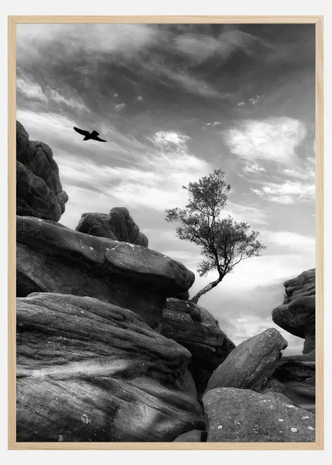 En dramatisk plakat med klippestykker, klipper, et træ og en sort fugl. En overskyet himmel med hvirvlende skyer leder øjet hen til den sorte fugl, der svæver ovenover. Et træ klamrer sig til siden af de glatte klipper, der bidrager til værkets dramatik. Bevar den episke vildmarksstemning ved at hænge det på en neutral væg.