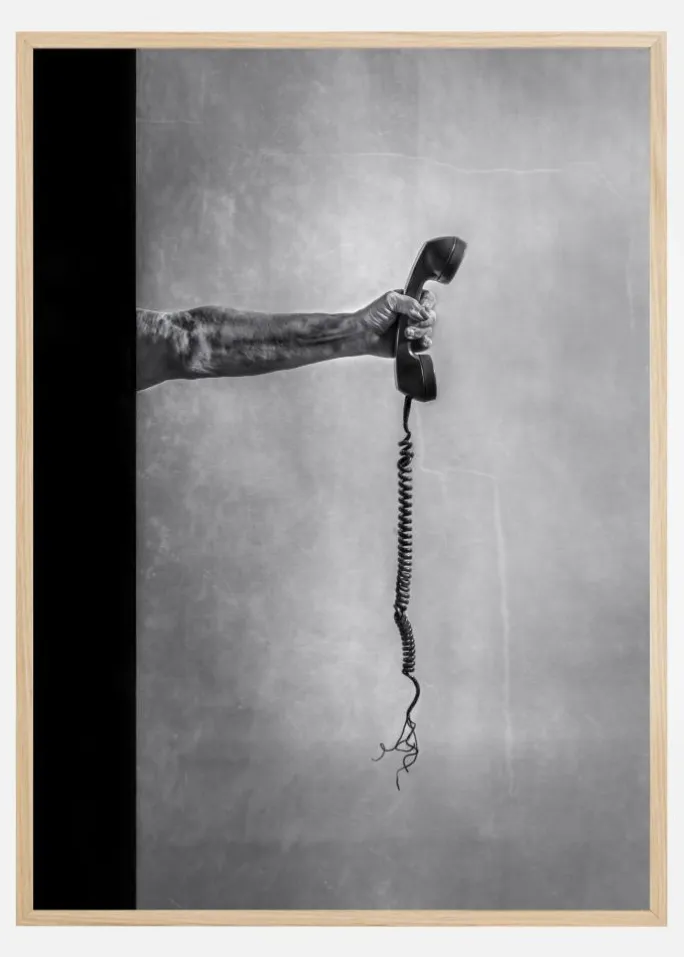 En sort/hvid plakat med en arm, der holder en telefonrør med en afbrudt ledning. Den stærke arm holder telefonen ud i midten af plakaten. Den sorte telefon og ledningen hænger ned mod en grå baggrund. Hvem holdes telefonen ud til? Slap af og tænk over dette billede derhjemme.