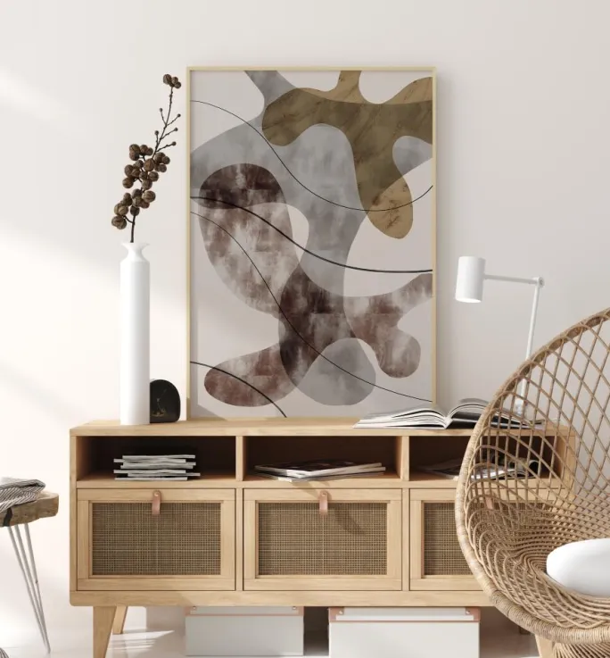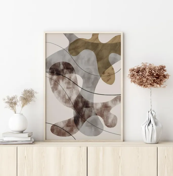 En abstrakt plakat med farver og forskellige mærkelige former og linjer. Tre hovedformer i gul, rød og grå, der ligner malingstænk, fylder billedet. Fire sorte bølgelinjer hvirvler hen over dem. Sæt denne plakat op på din væg og få galleri-følelsen i dit hjem.