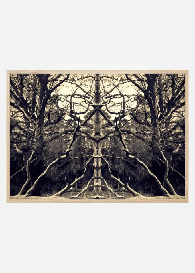 En fantastisk kalejdoskopisk plakat af træer og deres grene. Spejlbilledet i dette billede giver en fascinerende plakat, hvor du kan se alle mulige ansigter og former. De lyse sepia-toner på denne plakat passer godt sammen med pastelfarver for at skabe en blødere stemning, der står i kontrast til billedets kompleksitet.