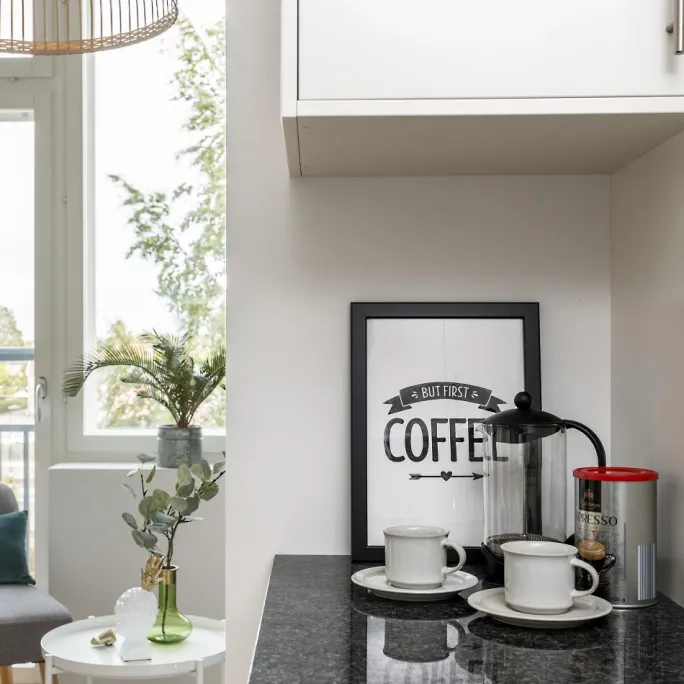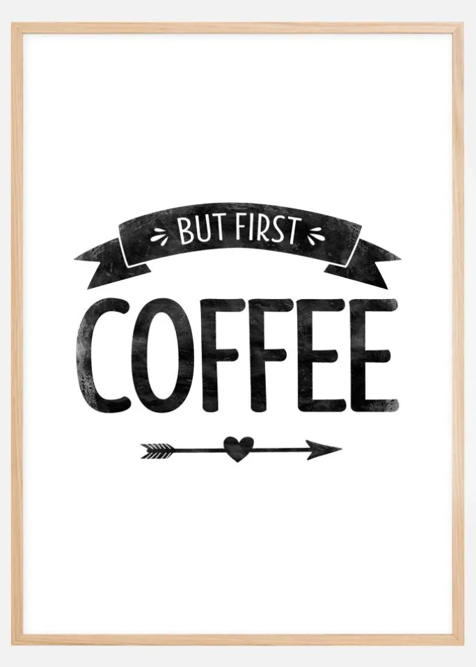 Skab en hyggelig retrofølelse i køkkenet eller på arbejdet med denne charmerende plakat! Printet er i sort og hvid og har teksten ”But first coffee” sammen med et banner og en pil, der går gennem et hjerte. Køkkentavler bliver ofte meget fine sammen med sølvfarvede rammer, der matcher køkkenvask, blandingsbatteri og andre metaldetaljer, som ofte findes i et køkken. Vælg mellem 6 forskellige formater afhængigt af, hvor stor en flade plakaten skal sidde på.