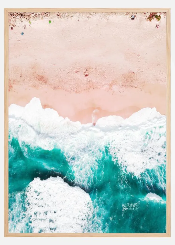 En plakat med luftfoto af lyseblå bølger, der når sandstranden. Skummende bølger skyller mod strandens bløde pastelrosa farve. Et par ekstra farvepletter viser de mennesker, der sidder på stranden. Farverne er perfekte til at fuldende din badeværelsesdekoration.