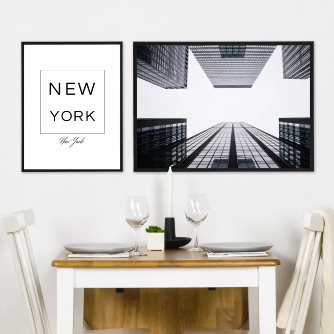 Arkitekturplakater med voksende skyskrabere mod en skyhvid himmel. Stilrent billede af mørke bygninger mod en hvid baggrund, med himlens refleksioner i glasruderne. Perfekt gave til den, der kan lide grafiske bygningsportrætter. Printet gør sig godt i en sort ramme, som forstærker det mørke i billedet og bliver fin i kombination med andre fotografier af arkitektur.
