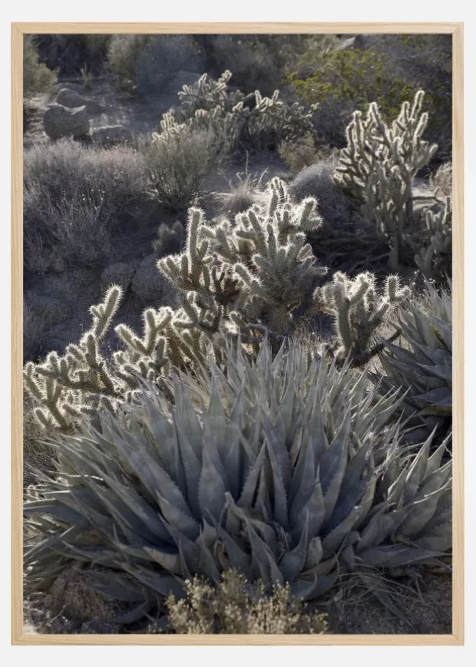 En smuk plakat af forskellige kaktusser i ørkenen. De skarpe spidse kanter på hver kaktus bliver blødgjort, hvor lyset berører piggene, hvilket skaber et usædvanligt billede. De bløde grønne og gule farver er rolige. Det er den perfekte tilføjelse til en blød gul eller grøn væg derhjemme.