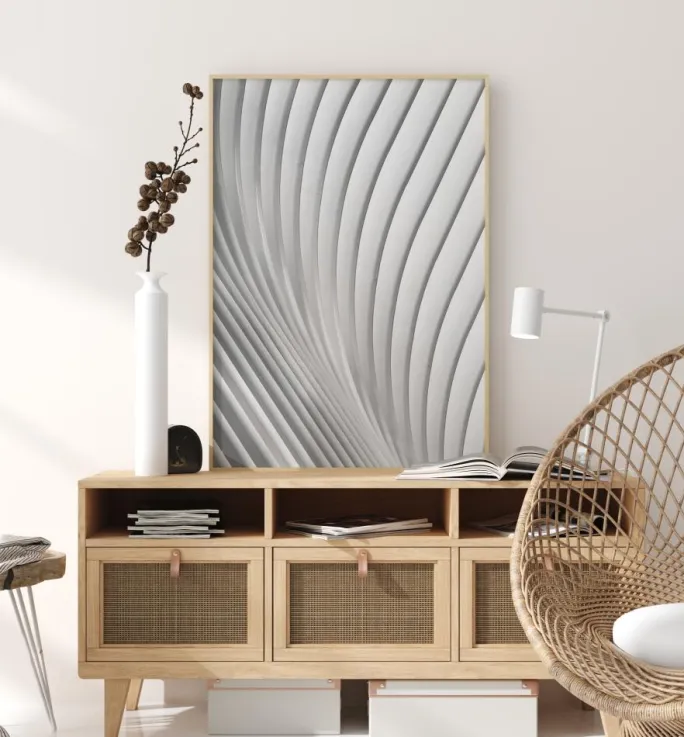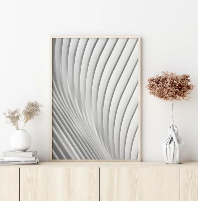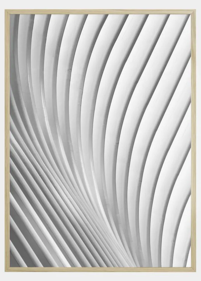 En abstrakt plakat med hvide og grå linjer, der bølger hen over billedet. Linjerne starter nederst til højre og kurver forsigtigt opad, før de bøjer sig rundt til øverst til højre. Selv om dette billede er enkelt, holder det opmærksomheden fanget, når du lader øjnene slappe af og følger linjernes strømning.