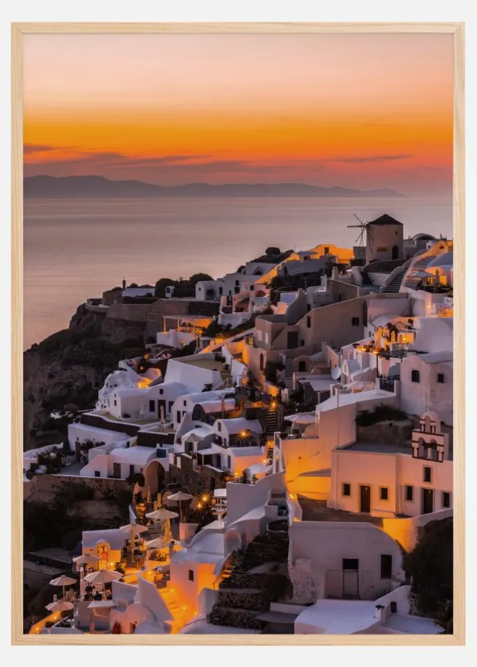 En malerisk plakat af Calispera Santorini ved solnedgang. Den lille by lyser blødt op i levende orange gadelys. De hvide huse skiller sig ud med det bløde, tågede hav og bjergene i baggrunden og den orangefarvede himmel, når solen går ned. Rejs uden at forlade dit hus, når du kigger på denne plakat.