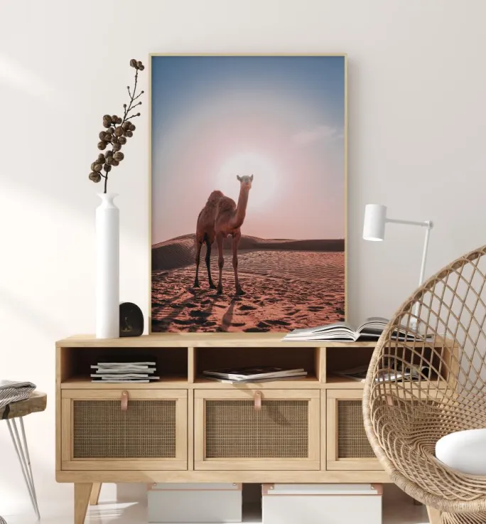 En vildtplakat af en kamel, der står i ørkenen. Kamelen vender ansigtet fremad i det bløde sand. Solen bagved skaber en dramatisk glorie bag kamelens hoved, hvilket får dyret til at skille sig endnu mere ud. Den lyseblå himmel står i kontrast til sandet og giver et mere unikt kamelportræt.