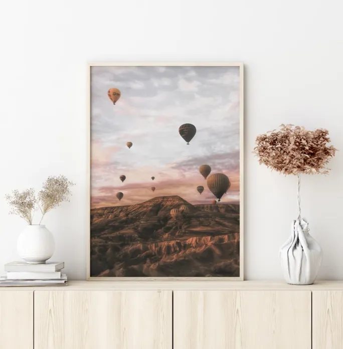 En magisk landskabsplakat af Kappadokien med varmluftsballoner, der flyver hen over hovedet. Bløde lyserøde klipper er oplyst af en usynlig sol, der også giver en rosenrød glød til den overskyede himmel. Varmluftballoner svæver opad. Få en opløftende følelse, når du hænger denne op derhjemme.