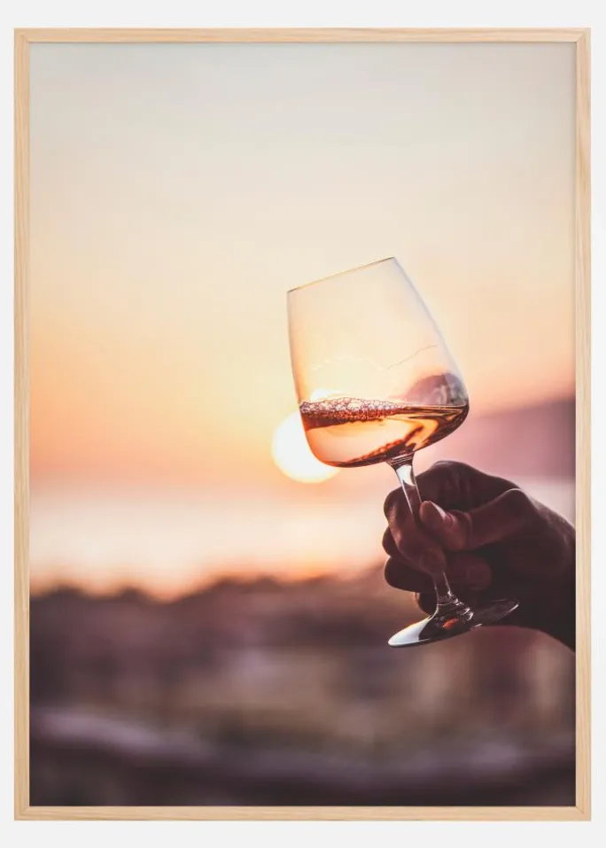 Denne plakat er en invitation til at tage en pause og nyde livets gode. Den fanger et øjeblik af afslapning, hvor en hånd holder et glas vin mod en varm og farverig solnedgang. Billedets fokus på vinets gyldne nuancer og glassets delikate kurver skaber en følelse af luksus og nydelse. Dette motiv er perfekt til vinelskeren eller for at skabe en afslappet og indbydende stemning i køkkenet eller stuen.