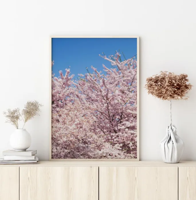 En naturlig plakat af en fantastisk række hvide kirsebærtræblomster mod en klar blå himmel. Hvide blomster fylder dette billede og står i stærk kontrast til himlen. Tag dette med hjem og fyld dit hus med en naturlig følelse, når du ser dette på din væg.