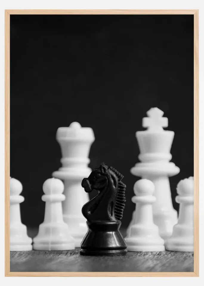 Denne tankevækkende plakat viser en klassisk scene fra spillet skak, med en ensom sort springer, der står over for en række hvide brikker. Det kontrastrige sort-hvide billede fremhæver ikke kun spillets tidløse natur, men også de strategiske og taktiske udfordringer, det repræsenterer. Springeren, ofte forbundet med kreativitet og utraditionelle træk, står modigt, selvom oddsene synes at være imod den.