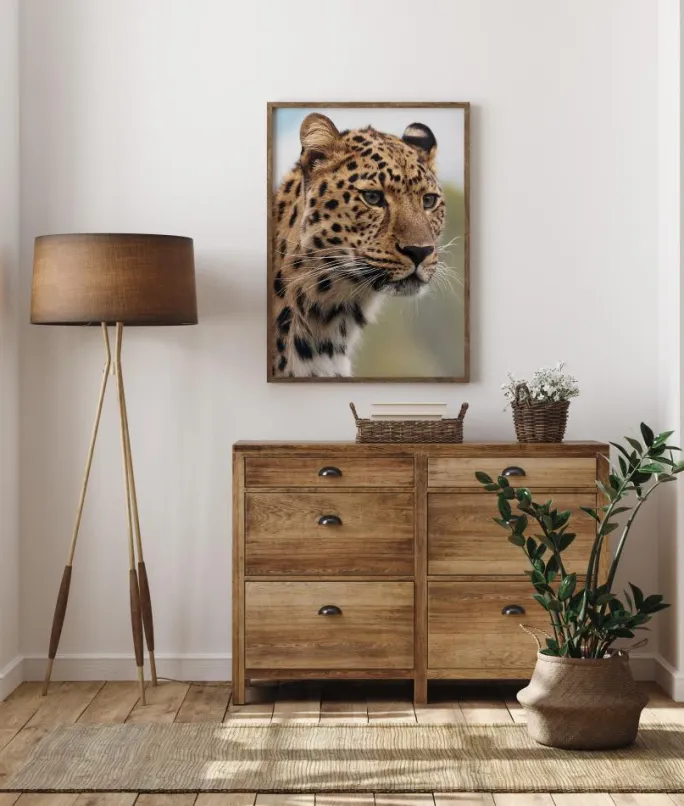 En dyrelivsplakat med et nærbillede af en leopard. Detaljerne på leoparden fremhæver pletterne, knurhårene og farverne i øjnene. Når du stirrer ud af billedet, undrer du dig over, hvad leoparden kigger på. Få den episke naturfornemmelse med denne plakat.