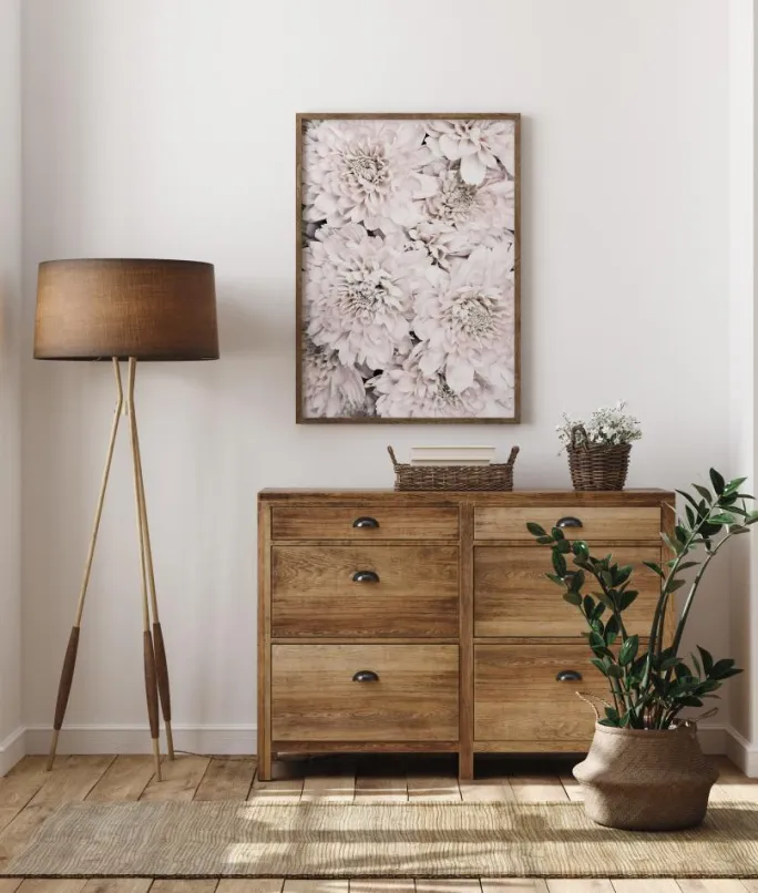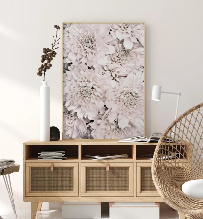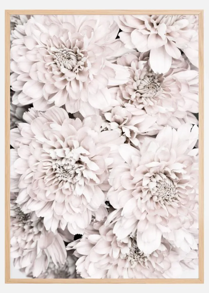 En elegant plakat med en samling af forskellige krysantemumblomster. Fire store krysantemumblomster fylder billedet, hver enkelt er delikat og fyldt med små kronblade. Sæt de bløde lyserøde og hvide toner sammen med en neutral væg i dit soveværelse for at få en magisk opvågning.