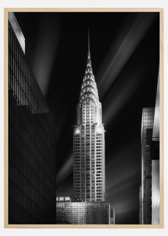 En natlig plakat af den oplyste Chrysler Building i New York. Chrysler-bygningen står i midten af billedet mod en sort himmel. Hvide lysstråler strejfer hen over himlen for at tilføje vinkler og dramatik. Gør et modigt statement med dette dramatiske sort-hvide billede.