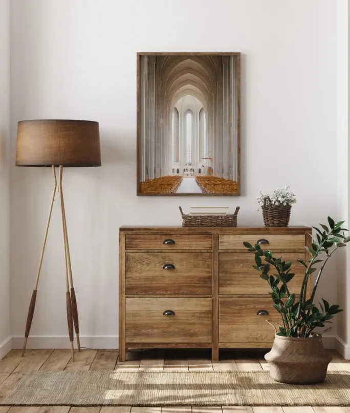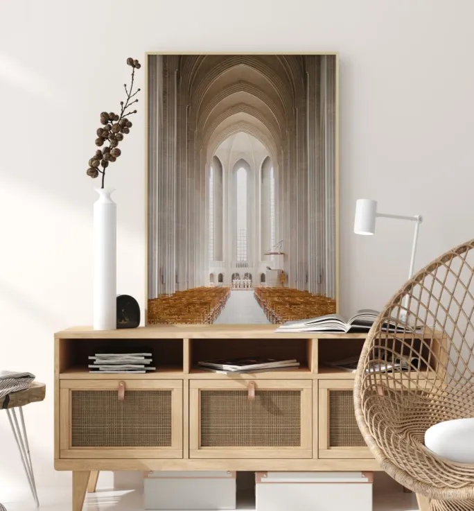 En romantisk plakat af et blødt kirkeinteriør. Lysbrune stole står langs gangen, mens høje søjler flankerer dem til hver side. De gotiske buer afgrænser stykket og leder øjet hen til det klare hvide lys for enden af kirkeskibet. Gå i kirke hjemmefra, når du hænger denne religiøse plakat op.