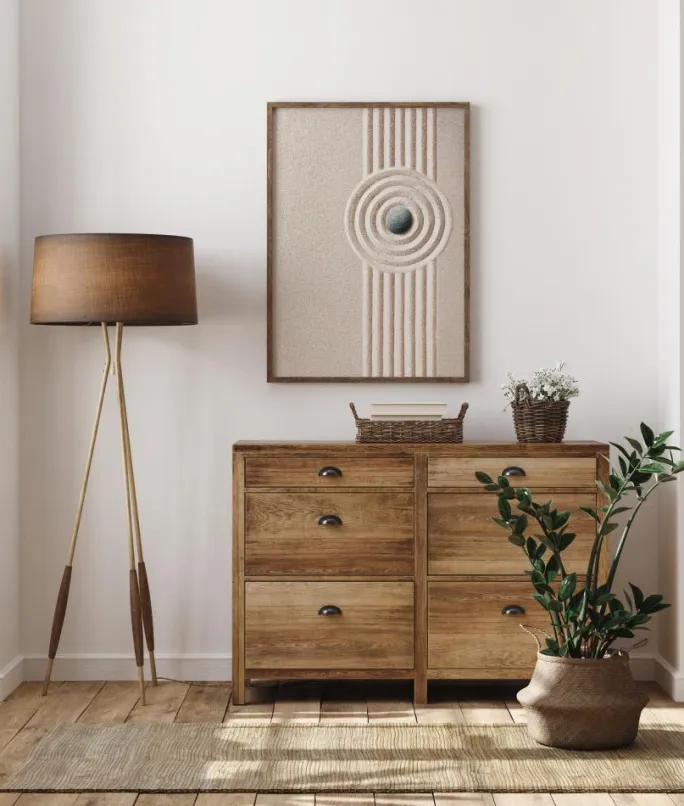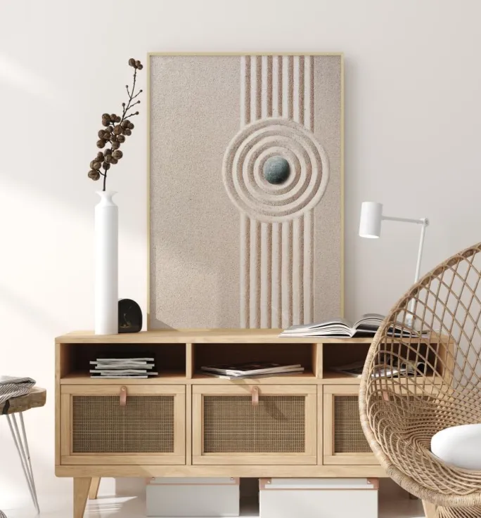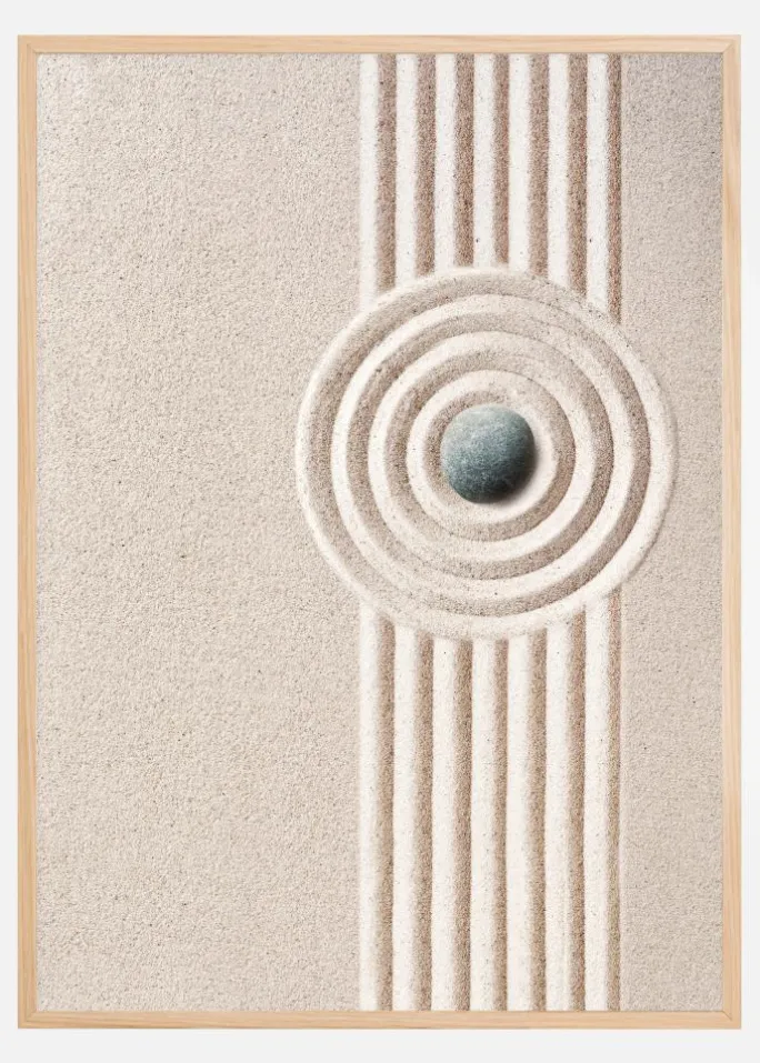 En geometrisk plakat med sandformer. Syv lodrette linjer er tegnet i sandet, og disse er skåret af en omhyggelig femringet cirkel. I midten ligger en enkelt blågrå sten. Forundres over perfektionen i denne elegante plakat med geometriske former.