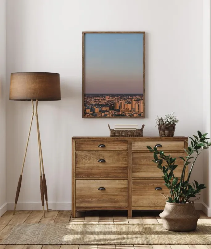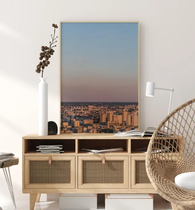 En vidvinkelplakat af en byudsigt fra luften med en massiv blå himmel bagved. Det tidlige morgenlys gløder over hele denne fjerne byscene og gør alle bygningerne blødt sandgule. Vær vidtløftig i dine tanker, når du ser på det store rum over byen.