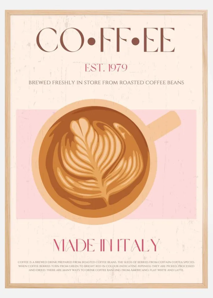 Denne stilfulde plakat hylder kaffekunsten, etableret i 1979, og fremhæver den rige tradition for kaffebrygning. Det smukke billede af en kaffekop med et imponerende latte art-bladmønster på toppen afspejler den passion og håndværkssnilde, som kaffeelskere over hele verden værdsætter. Den sofistikerede typografi og den let rosa tone i baggrunden bidrager til en klassisk og elegant følelse, der er synonymt med italiensk kaffekultur.