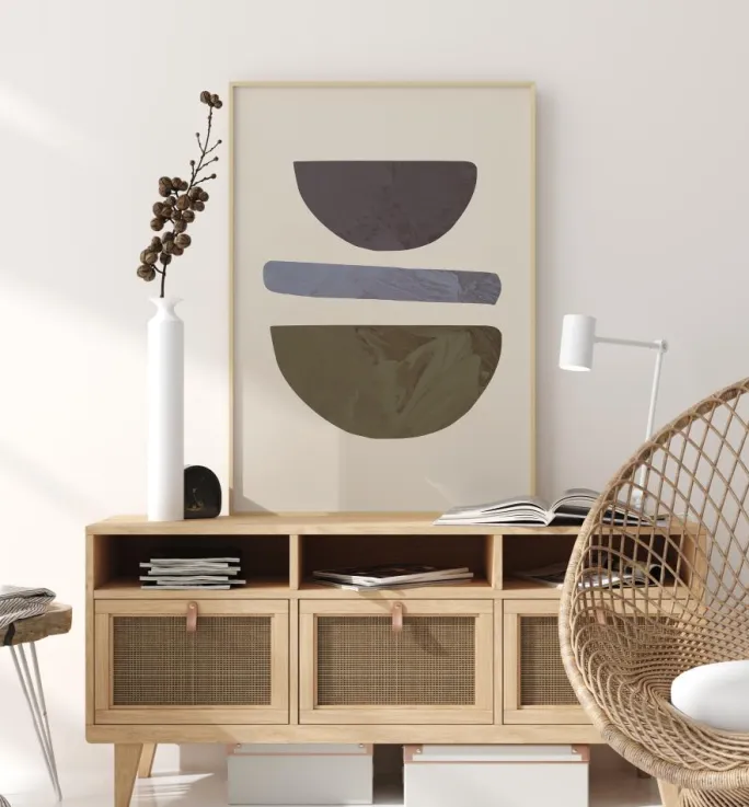 En abstrakt plakat med tre forskellige former og farver. En brun halvcirkel sidder i bunden med en lyseblå streg i midten af billedet. Ovenover er der en mørkegrå halvcirkel, alt sammen på en hvid baggrund. Sæt denne plakat på en almindelig væg for at få et godt samtaleemne.