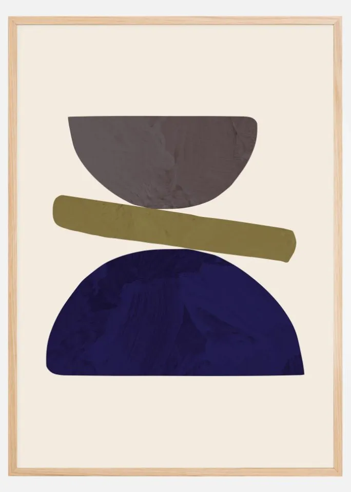 En plakat om balance gennem geometri. En stor blå halvcirkel balancerer en tynd grøn aflang form på sin kurve. Oven på den balancerer en grå halvcirkel for at skabe en timeglasform. Brug timer på at kigge på dette værk for at finde de andre former i det.