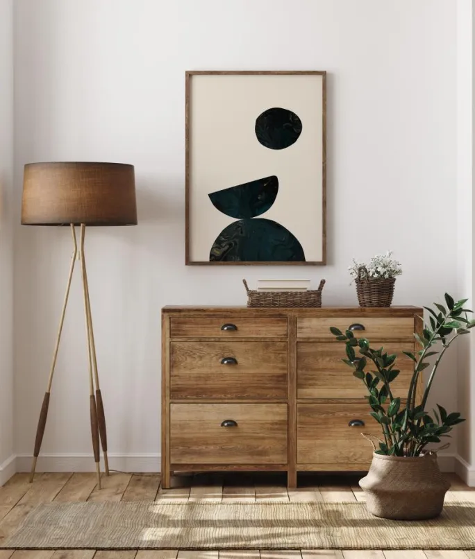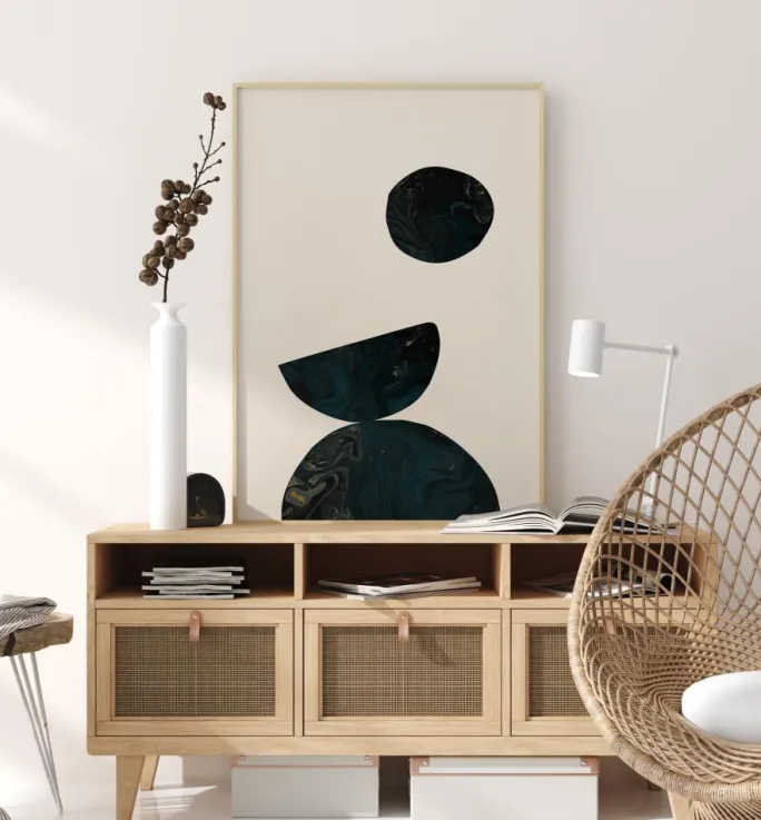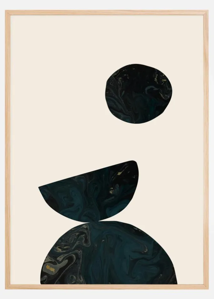 En lys plakat med tre mørkeblå og sorte former, der skaber et overbevisende billede. En halvcirkel sidder i bunden og balancerer en anden opadvendt halvcirkel. Ovenover svæver en sort cirkel, alt sammen på en slående hvid baggrund. Match de smukke marmorhvirvler med en lysere tone på væggene for at skabe ekstra dramatik.