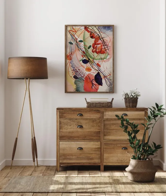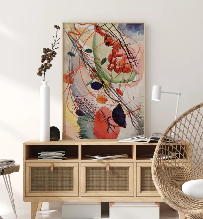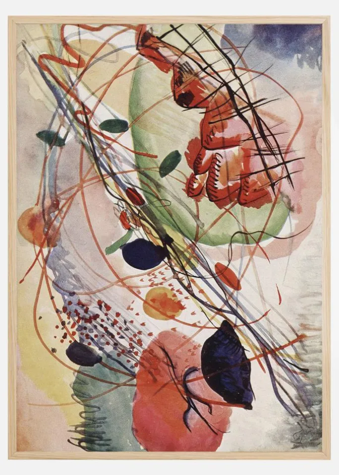 En levende plakat fuld af abstrakte farver og former, der skaber et dramatisk, næsten kaotisk værk. Store farveklatter, farverige prikker og strejfende linjer gør dette til et dramatisk værk, mens dit øje bevæger sig rundt i billedet for at opdage, hvad der sker. Skab en følelse af hastværk, når du hænger dette op i hallen.
