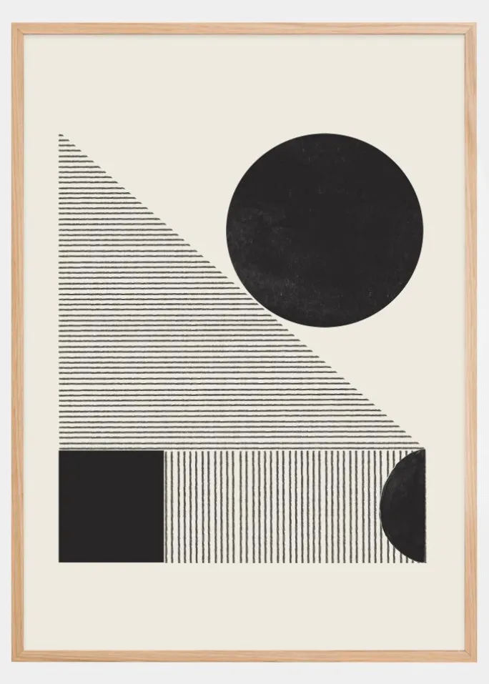 Denne plakat er en legende og sofistikeret fortolkning af geometrisk abstraktion. Sorte og hvide linjer spiller sammen i et omhyggeligt balanceret mønster af former, mens den store sorte cirkel dominerer den øvre del af kompositionen og skaber et stærkt visuelt ankerpunkt. Det kontrasterende spil mellem de fyldige sorte områder og de hvide linjer inviterer betragteren til at udforske de forskellige teksturer og dybder i billedet.