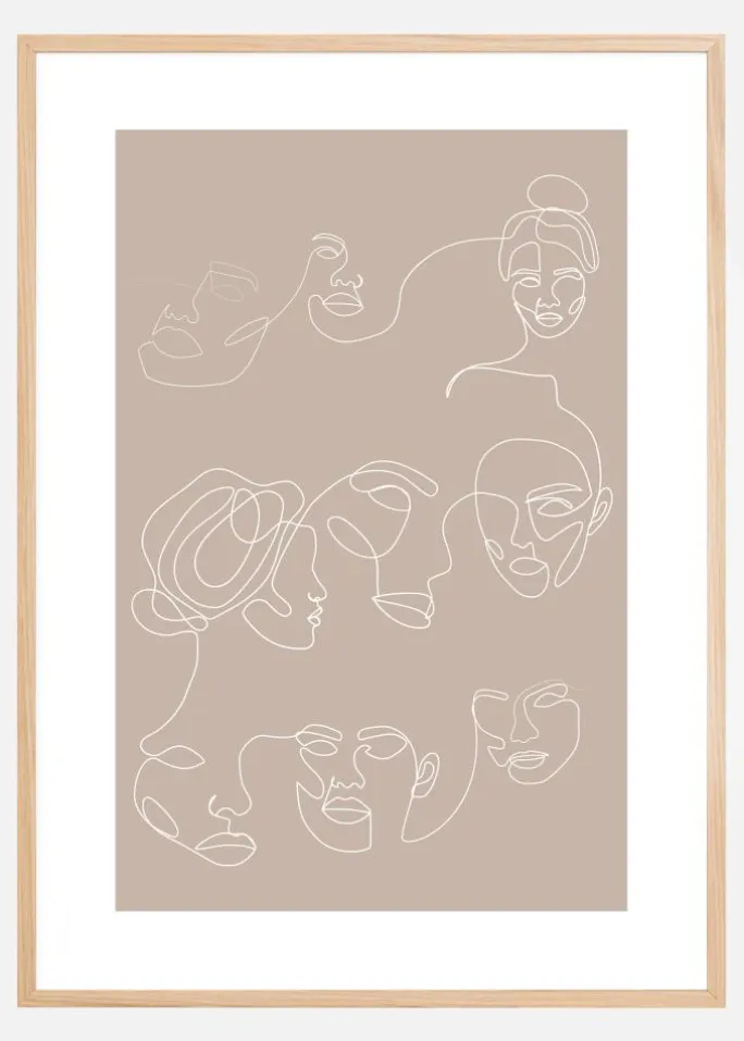 En skitsebogsplakat med en række forskellige abstrakt tegnede hoveder og ansigter. Disse abstrakte hoveder er alle tegnet med en enkelt linje, så de alle er samlet i en lang linje. De hvide linjer på den beige baggrund ville fungere sammen med en væg i en fed farve for at skabe en kunstnerisk stemning.