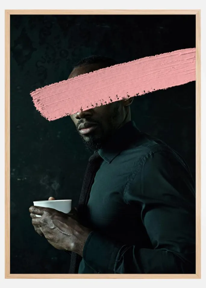 Denne kunstneriske plakat fremhæver en mand i profil, der holder en hvid kop, med en tankevækkende detalje, hvor hans øjne er skjult af et svævende lyserødt farvestrejf. Scenen giver et sofistikeret og moderne indtryk, perfekt til at tilføre en moderne følelse til ethvert rum. Farverne i motivet er nuancer af sort fra mandens mørke skjorte og baggrund, i stærk kontrast til den bløde lyserøde nuance, der dækker hans øjne. Der er et strejf af varme i den blidt brune tone af hans hud, hvilket skaber en harmonisk palet.