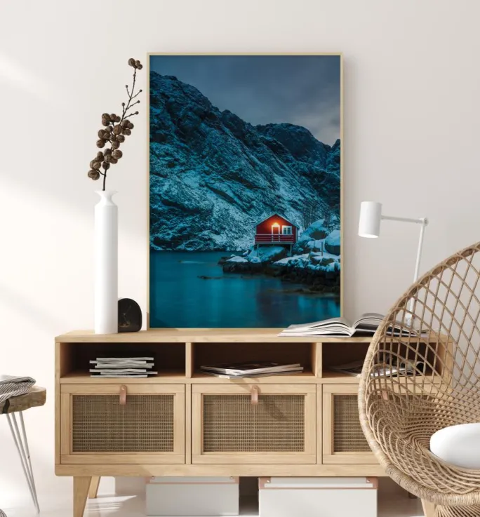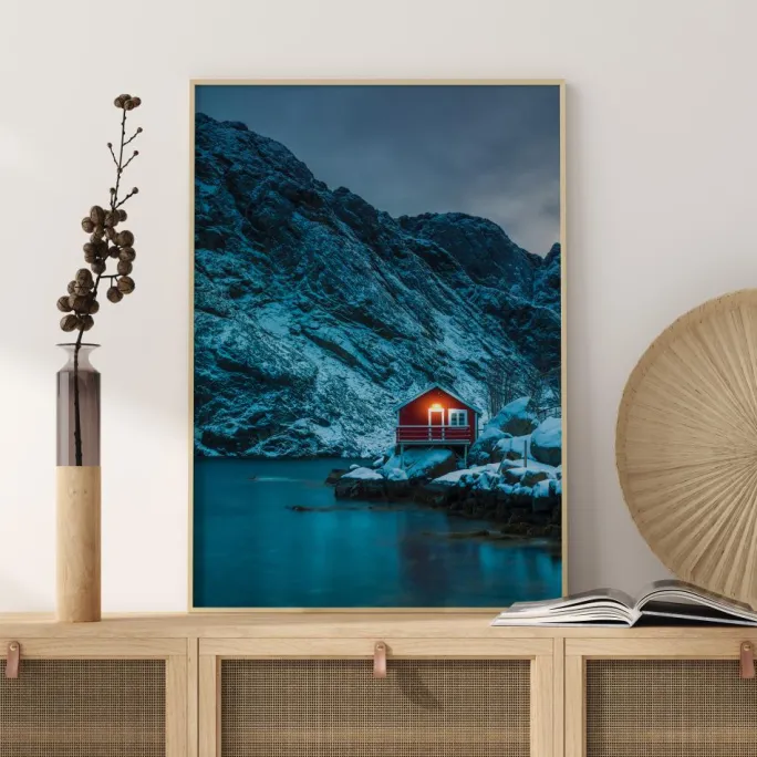 En hypnotiserende plakat af siden af et sneklædt bjerg med en lille rød hytte. Følg lysets fyrtårn til den lille røde hytte i denne enorme udstrækning af iskolde sne og blå farver. Søen er næsten frosset til, og den eneste varme er det røde hus. Føl det hyggelige lys vinke til dig, når du hænger denne op.