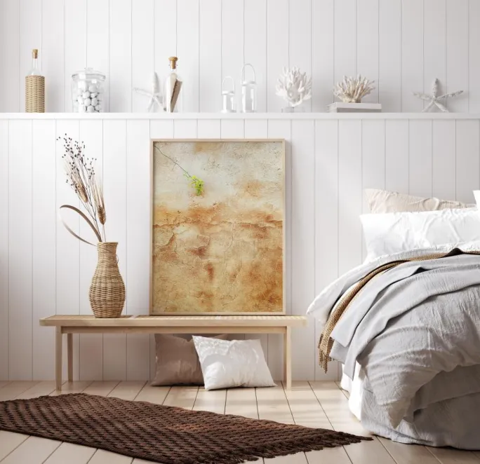 En nærbillede af en revnet væg med en lille lysegrøn plante, der vokser ud af den. Væggen er blødt jordbrun, men den tynde grønne revne og den lyse plante står i modsætning til den bløde jordbrune farve. Lad dit øje vandre, indtil det finder alle de mærkelige revner i denne teksturelle overflade. Sammensæt dette med en væg i samme farve for at opnå den bedste illusion.