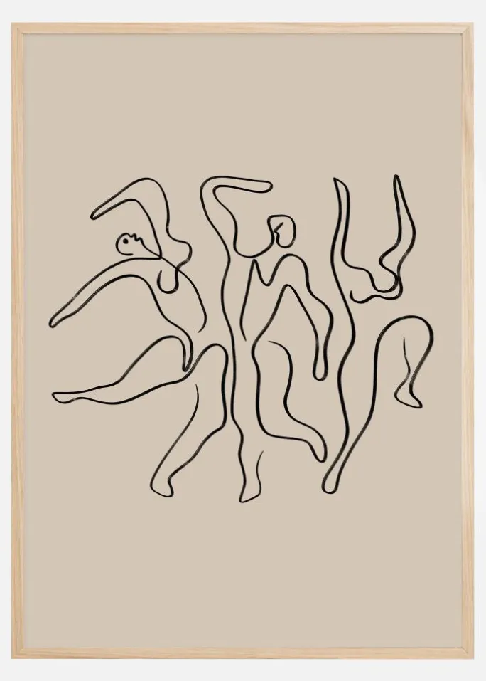 Denne kunstneriske plakat præsenterer en serie abstrakte figurer, der gennem deres flydende linjer fremhæver en følelse af bevægelse og dans. Den enkle men udtryksfulde illustration i sort mod en rolig beige baggrund tilbyder et minimalistisk men levende udtryk. Denne type motiv er perfekt til dem, der sætter pris på subtile, men kraftfulde kunstværker, der inspirerer til bevægelse og frihed.