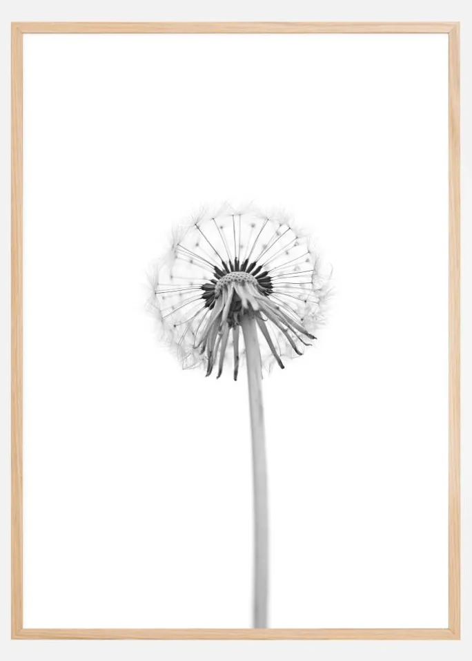 En lys, ren naturplakat med en mælkebøtte på en hvid baggrund. Dette overvejende hvide billede vil skille sig ud på en livlig blå eller grøn væg. Det er det perfekte print til en gallerivæg.
