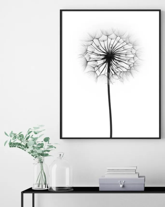 Rigtig lækker kunsttryk med et fotografi af en mælkebøtte, der er klar til at sende sine frø afsted i vinden. Mælkebøttens grafiske opbygning og det sort-hvide billede giver et motiv, der er smukt i sin enkelthed. Prints passer godt til at hænge op sammen med grafiske kunsttryk, citatplakater eller sort-hvide fotografier for at skabe en væg, der bliver et blikfang i rummet. Kompletter med en sort eller hvid billedramme for at motivet skal komme til sin ret.
