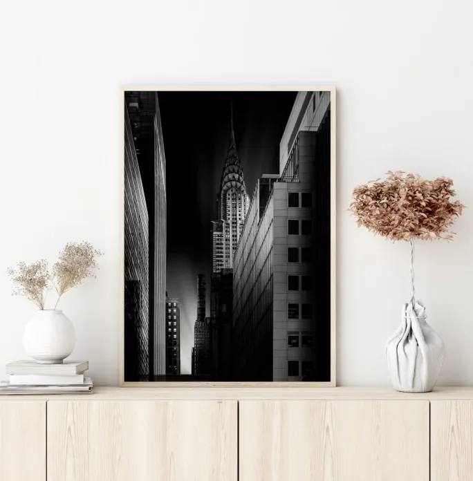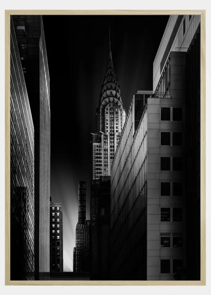 En urban plakat af Chrysler-bygningen om natten. En smal gade trækker øjet ned til et skarpt lys, der rammer himlen. Til højre kan man se den skyggefulde Chrysler-bygning i dette lidt uhyggelige billede. Hæng den op på en hvid væg for at give den samme følelse af kunstgalleri.