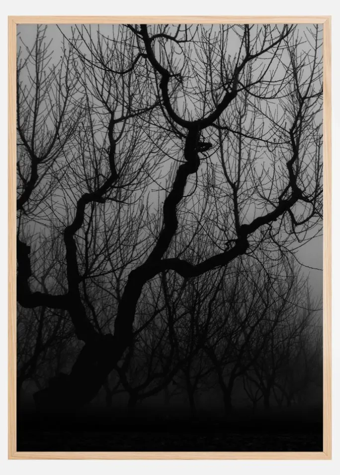 En ildevarslende plakat af et mørkt snoet træ om natten. Den knudrede træstamme spiralerer op fra venstre side af billedet, og de tykke grene er knudret mod en kedelig grå himmel. I baggrunden klynger sig en række mørke sammenfiltrede buske og grene. Tilføj dette billede til en mørk væg for at opnå en virkelig stemningsfuld, men alligevel spændende stemning.