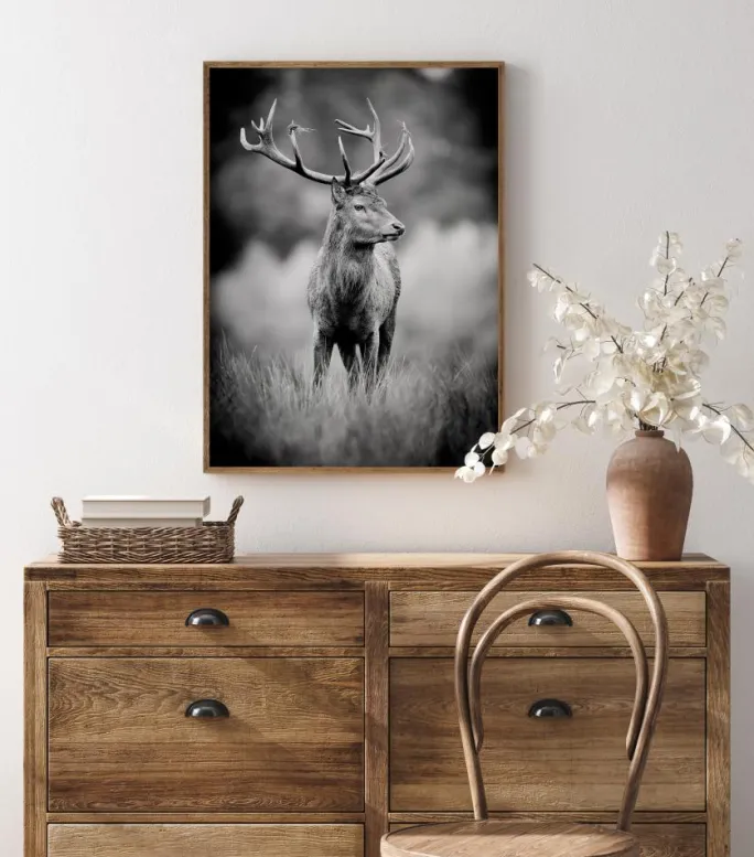 En vildtplakat af en hjort med gevir i sort/hvid. Vignetten får det til at føles, som om du betragter ham gennem en kikkert på afstand, som du ville gøre det i naturen, hvilket gør denne scene endnu mere speciel. Hans drejede hoved betyder, at han ser tilbage på dig og trækker dig ind i billedet.