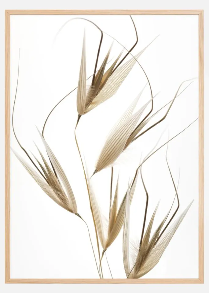 En delikat plakat med elegante græsfrø. De fem græsfrøhoveder ligger elegant hen over den hvide baggrund i bløde brune og beige farver på den hvide baggrund. Hver enkelt er delikat med bladrenes årer perfekt gengivet. Mind dig selv om, hvor skrøbelig naturen er med denne elegante plakat.