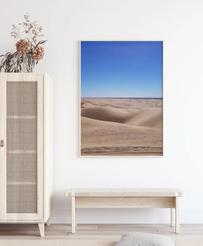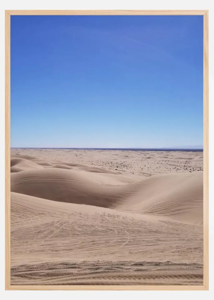 En stemningsfuld plakat af et ørkenlandskab. Ørkenens dybe røde farve hjælper de bølgende sandklitter med at stige og falde og trækker dit øje gennem scenen. Den bløde blå himmel og de tågede lyserøde farver er med til at skabe en tidlig morgenstemning. Nyd de store naturscenerier, når du tager dette med hjem.