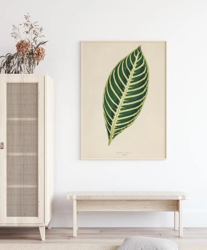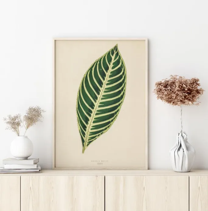 En botanisk plakat af Dieffenbachia-bladet. Dette omhyggelige videnskabelige maleri af bladet viser de grønne og gule ribber langs hovedstænglen i skarpe detaljer. På en hvid baggrund er dette det perfekte værk til enhver naturforsker eller til dem, der er interesseret i blade.