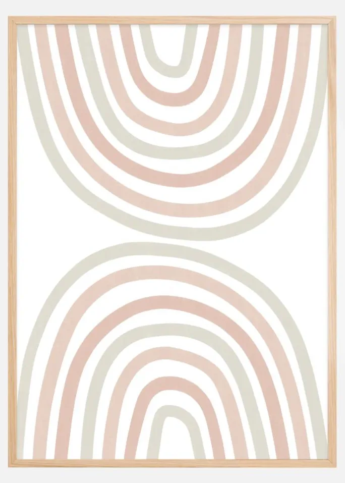 Denne moderne og minimalistiske plakat, titlen “Double Rainbow”, viser en serie koncentriske buer, der danner en dobbelt regnbue med et roligt og afslappet farveskema. De bløde toner af blåt, beige og terrakotta er perfekt afbalanceret for at skabe en følelse af harmoni og ro i dit rum. De rene linjer og det enkle design gør dette print til en stilfuld tilføjelse til enhver moderne indretningsdesign.