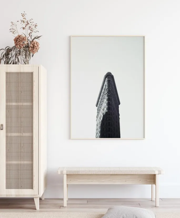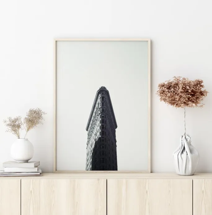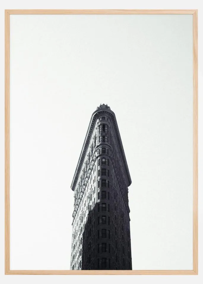 En arkitektonisk plakat, der viser det forreste hjørne af en gammel boligblok. Facaden af bygningen ligner forenden af en skibsbåd, der skiller sig kraftigt ud mod den hvide himmel. Den trekantede form trækker øjet ind og op gennem bygningen. Sæt dette billede på en væg i blokfarve for at skabe en kunstnerisk stemning.