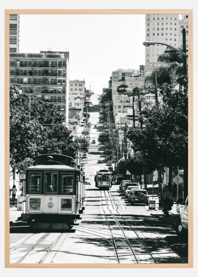 En plakat med et bybillede af San Francisco centrum. En sporvogn sidder i forgrunden, mens den bevæger sig op ad bakken gennem husene og træerne på hver side. Dette sort-hvide print tilføjer et strejf af klasse til enhver væg, du vælger at hænge det op derhjemme.