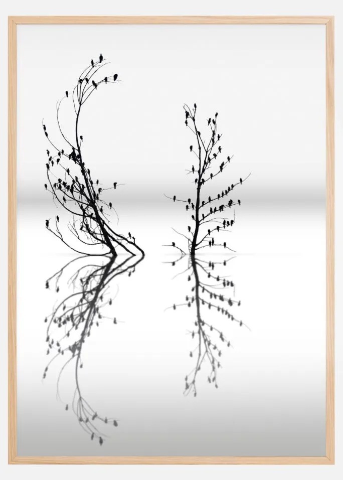 En simpel plakat med to grene, der rækker op af vandet. De mørke grene bøjer og vrider sig og kaster deres refleksioner på det stille vand nedenunder. De bløde blå og hvide toner i dette værk giver en atmosfære af ro, som du kan nyde, når du har dette derhjemme.