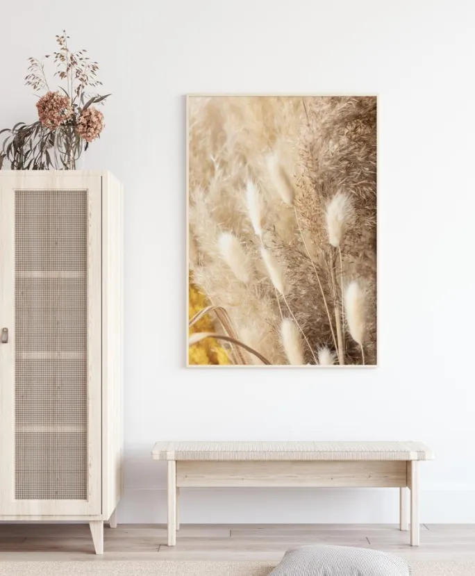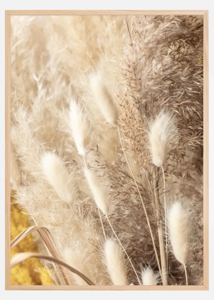En plakat med tørrede blomster i en buket. De lyse, dæmpede brune og gule farver skaber en virkelig blød følelse, der er god til et børneværelse. Mærk den afslappede fornemmelse, som dette teksturerede værk frembringer.