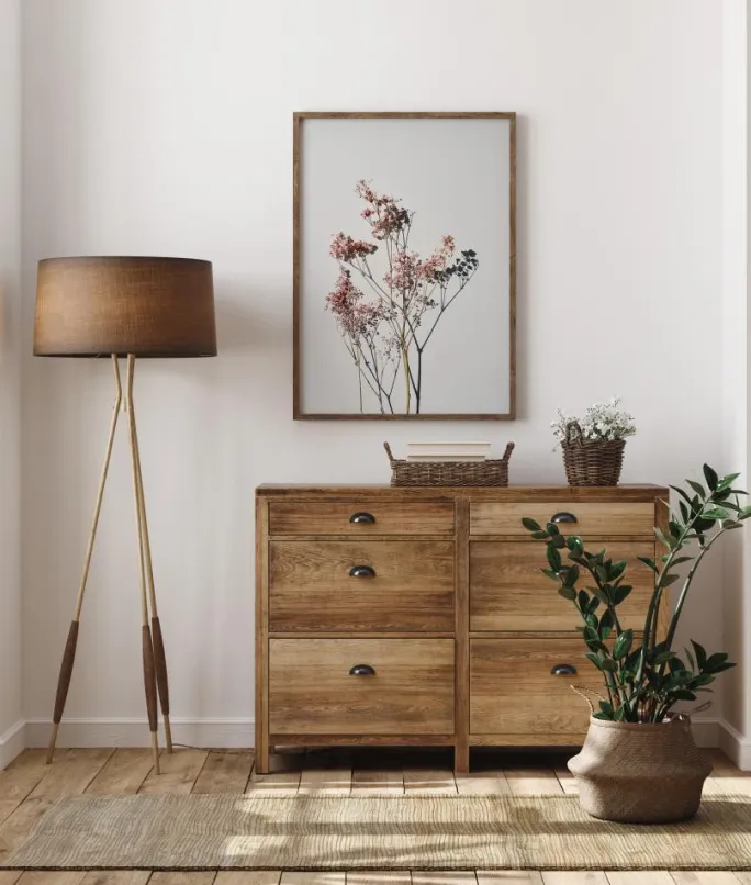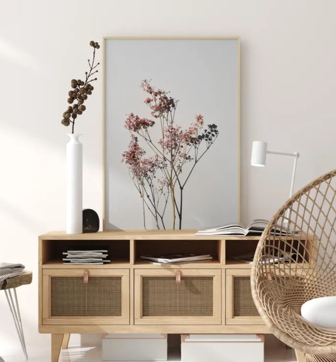 En elegant plakat af en klynge tørrede blomster på en solrig, lyseblå baggrund. De tørrede blomster står højt med de små blomster i forskellige rosa nuancer. Det bløde lyseblå lys giver en følelse af forår og bringer en lethed ind i dit hjem.