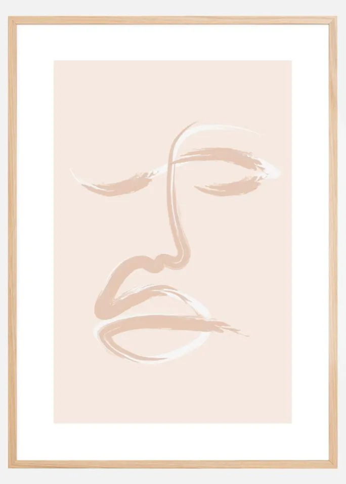 En abstrakt portrætplakat med fede lyserøde penselstrøg, der skaber et ansigt. Et enkelt penselstrøg hvirvler hen over siden og skaber næse og mund. Øjnene er tilføjet på en måde, der næsten er et blink. Med den hvide kant får du dette til at skille sig ud på en pastelfarvet væg.