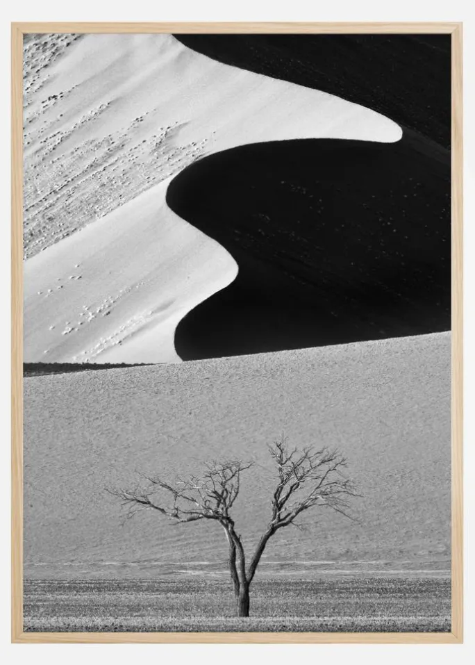 En dramatisk plakat med bølgende klitter og et ensomt træ. Dette skarpe billede sætter klitternes sorte og hvide kurver op mod træets statiske stilhed. Skab en ærefrygtindgydende stemning med dette værk.