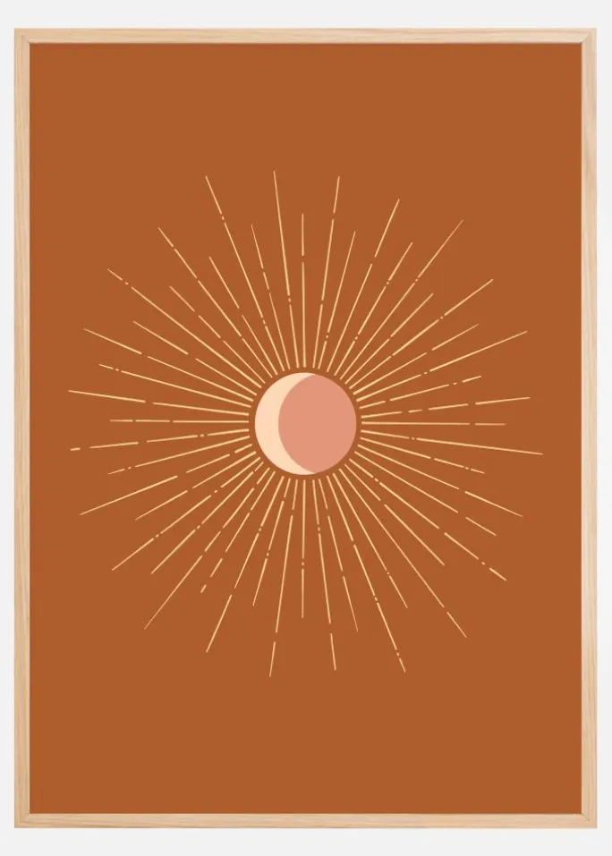 Denne minimalistiske og elegant designede plakat med en abstrakt solformørkelse bliver en stilren og moderne accent på enhver væg. Med dens rene linjer og strålende motiv mod en dyb terrakotta baggrund, repræsenterer denne print en perfekt blanding af enkelhed og sofistikering. Det centrale element i designen, en cirkel med en eksplosion af linjer, symboliserer lys og energi, og tilføjer en dynamisk effekt i rummet.