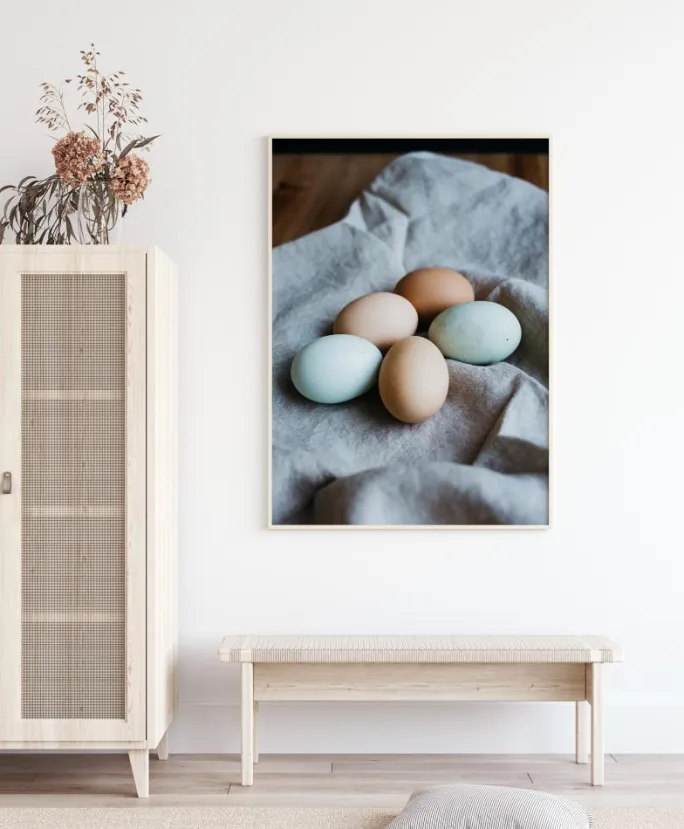 En stillebenplakat med fem æg på en hvid dug på bordet. Æggene er i forskellige brune og hvide farver og ser nylagte ud. De varme toner skaber en rustik følelse, hvor du kan sætte pris på den naturlige stemning. Perfekt til et landligt køkkenmiljø.